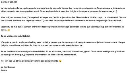 "Grace à Gabriel j'ai enfin pu découvrir ce que signifiait recevoir du plaisir de qualité. J'ai aussi découvert que toutes les femmes peuvent être femmes fontaines... Cela n'est pas trop tôt à 34 ans !"